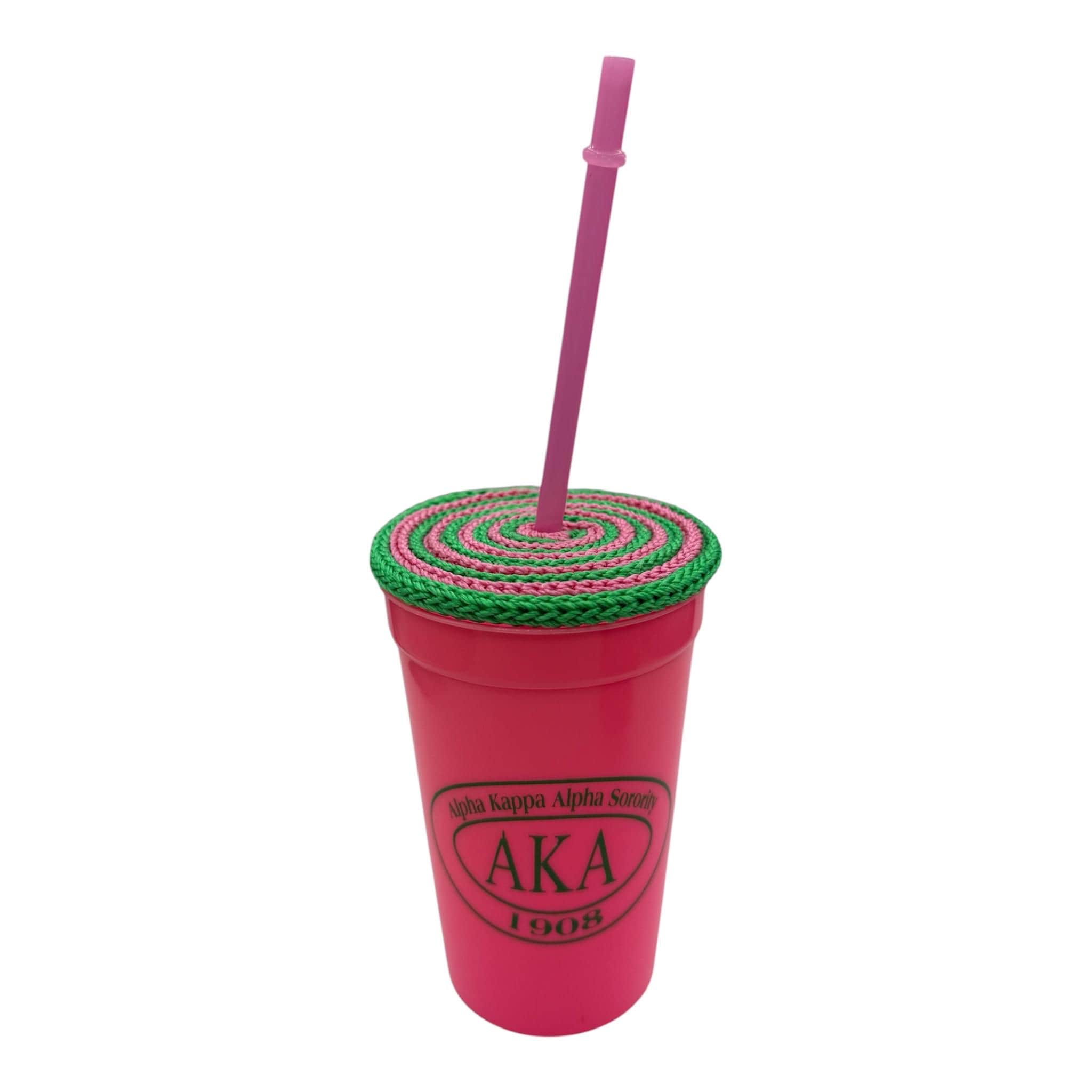 Cup cover color(s): pink and green swirl